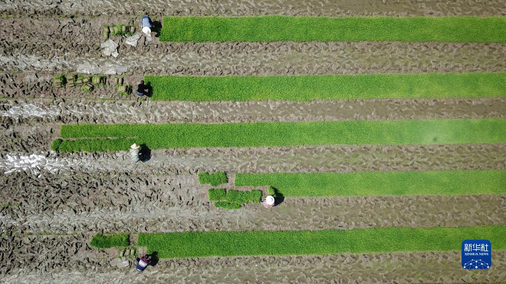 4月26日,在湘潭市雨湖區姜畬鎮易建河村,農民在田間起秧(無人機照片)。