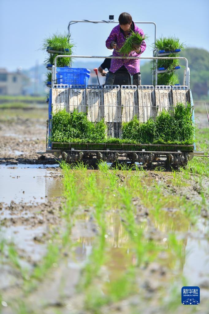 4月26日,在湘潭市雨湖區(qū)姜畬鎮(zhèn)易建河村的一處高標(biāo)準(zhǔn)農(nóng)田,農(nóng)民駕駛插秧機(jī)插秧。