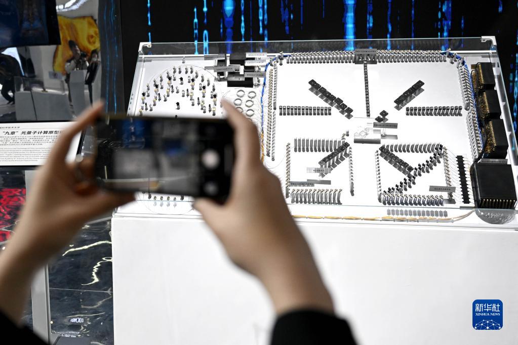 4月26日,觀眾在第二屆中國(guó)(安徽)科技創(chuàng)新成果轉(zhuǎn)化交易會(huì)上拍攝“九章”光量子計(jì)算原型機(jī)模型。