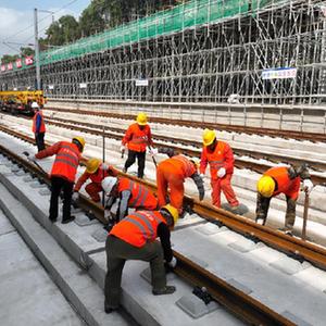 4月26日,在昌景黃高鐵浮梁東站,工作人員在緊固螺栓,將對接好的鋼軌固定。