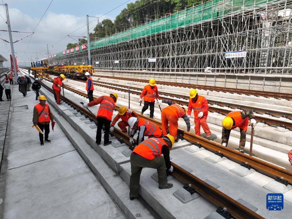 4月26日,在昌景黃高鐵浮梁東站,工作人員進(jìn)行鋪軌作業(yè)。