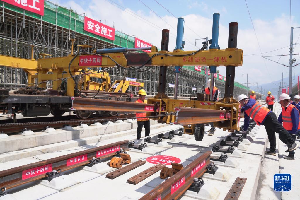 4月26日,在昌景黃高鐵浮梁東站施工現(xiàn)場,工作人員利用機械將鋼軌放入承軌槽。
