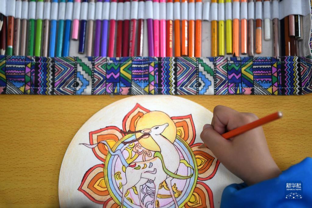 4月26日,在敦煌市西關小學,美術社團的學生在課后服務時間進行帶有敦煌壁畫元素的團扇繪畫。