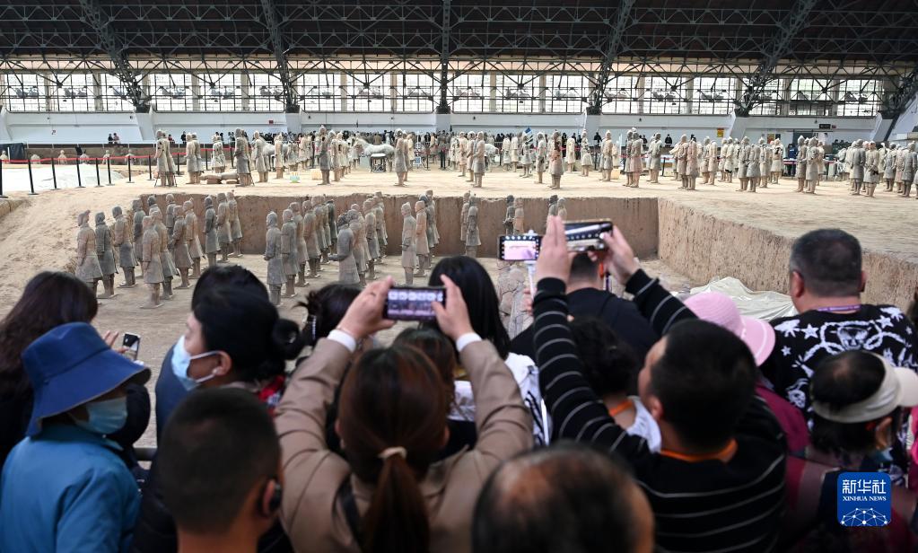 4月26日,游客在秦兵馬俑一號坑遺址內(nèi)參觀。