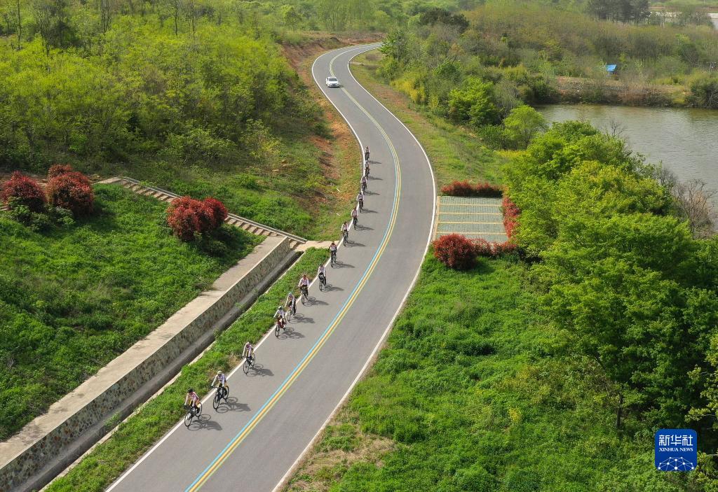 4月12日,騎行愛好者在江蘇省句容市天王鎮(zhèn)騎行(無人機照片)。