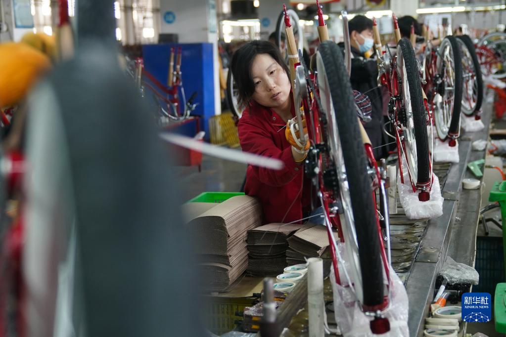 4月12日,在位于江蘇省句容市的江蘇泰茂車業有限公司,工人在自行車生產線上忙碌。
