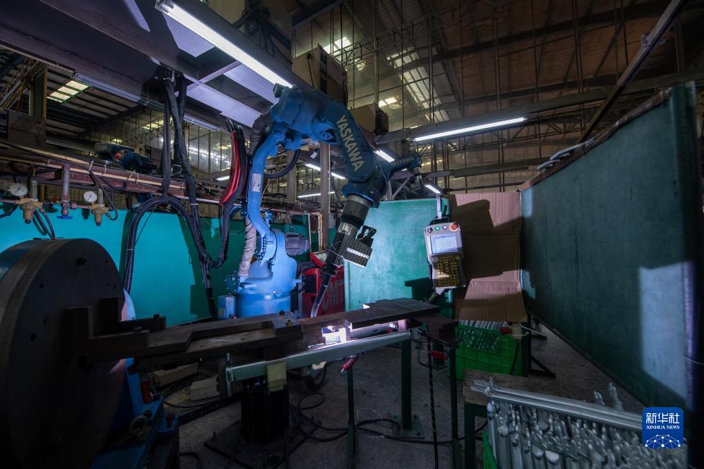4月13日,在深圳市喜德盛自行車(chē)股份有限公司生產(chǎn)線,機(jī)械臂焊接車(chē)架。