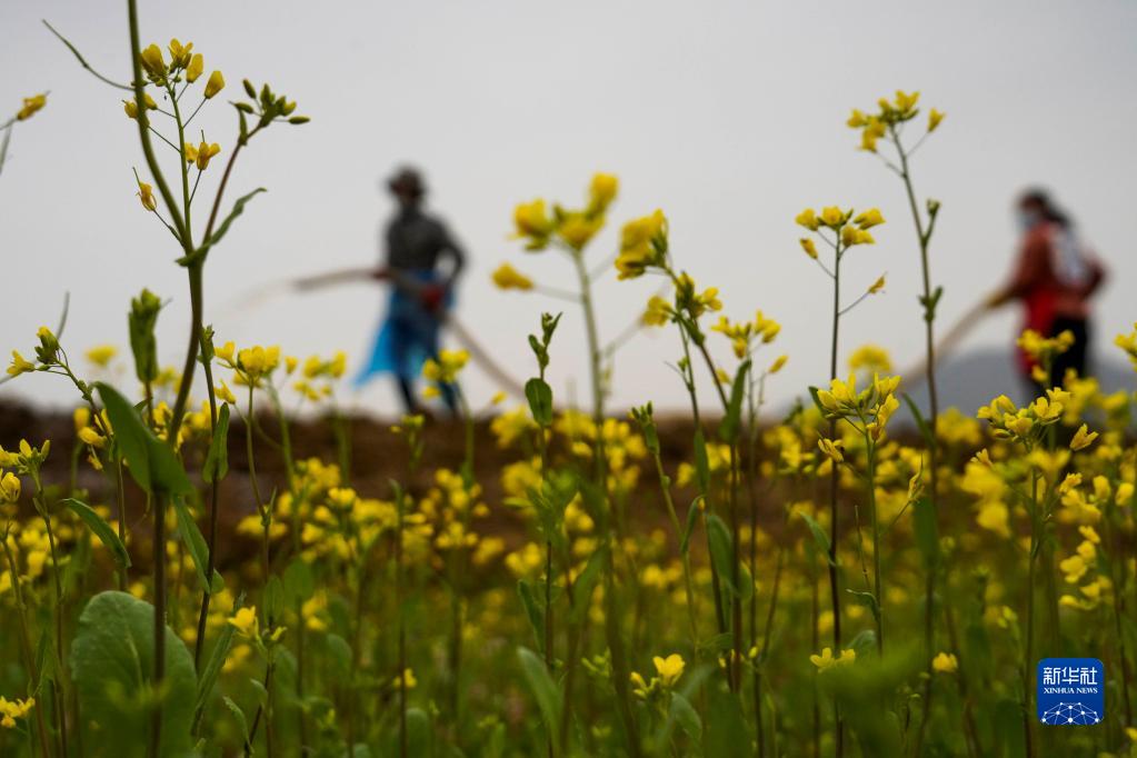 4月27日,農(nóng)民在河北省遵化市山里各莊村油菜花田間澆水。