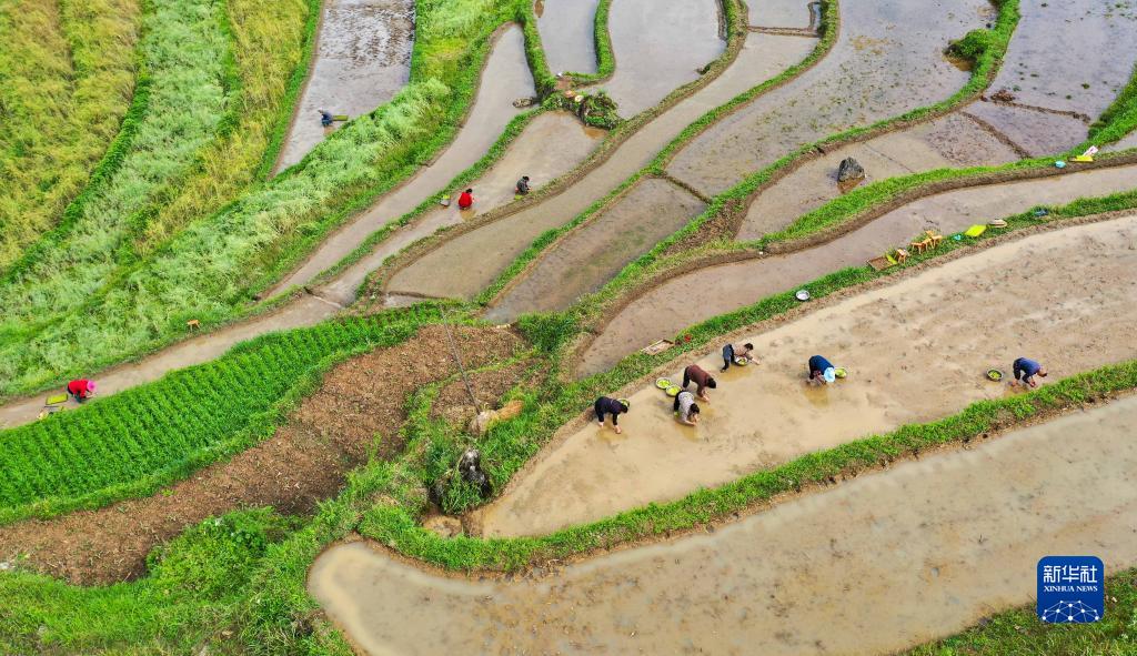 4月26日,農民在貴州省銅仁市玉屏侗族自治縣亞魚鄉郭家灣村田間育秧(無人機照片)。