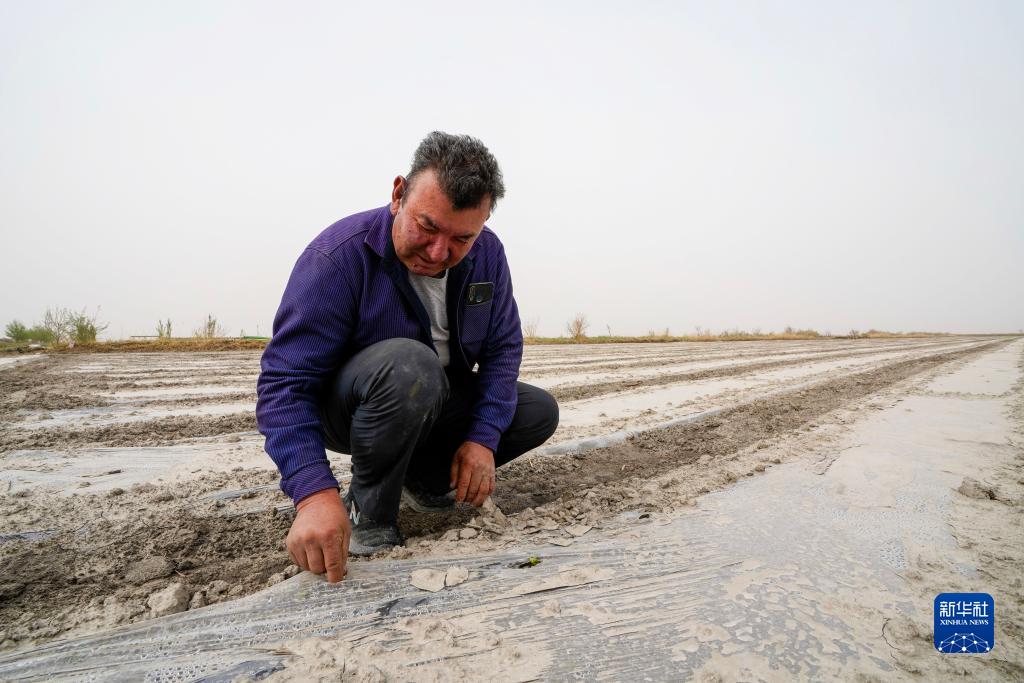 新疆尉犁縣巴西買里村,爾肯·熱衣木在棉田里查看棉花嫩芽生長(zhǎng)情況(4月22日攝)。