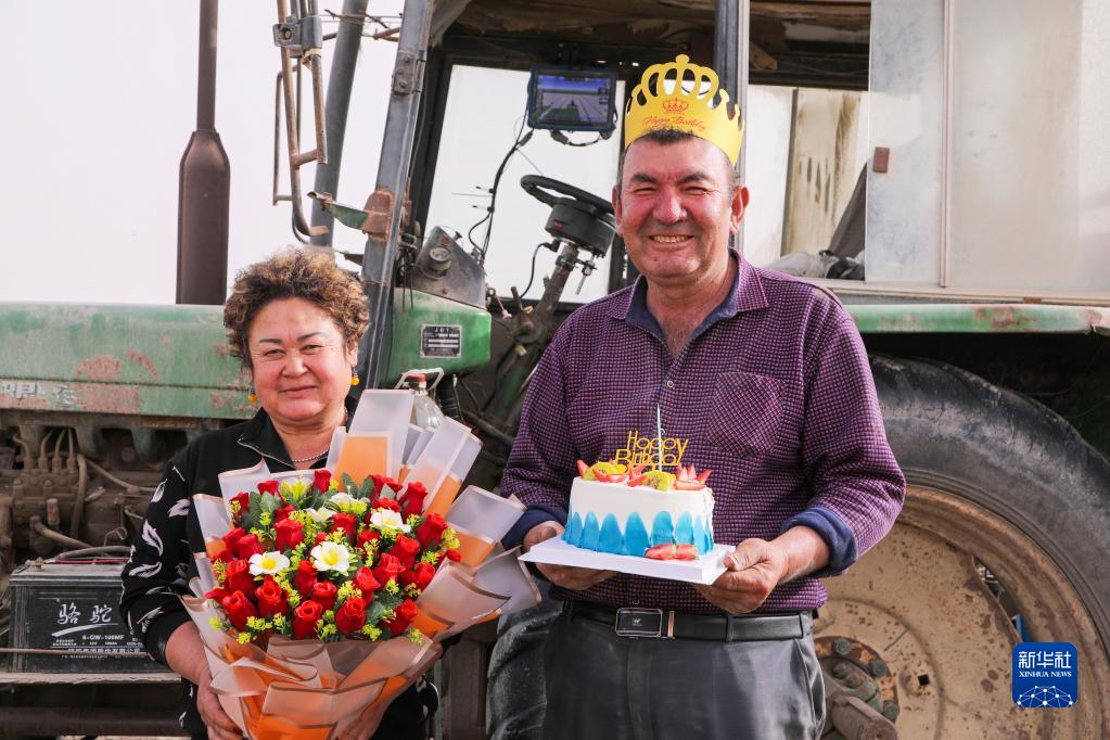 新疆尉犁縣巴西買里村,爾肯·熱衣木(右)端著生日蛋糕,和愛人站在拖拉機前留影(4月17日攝)。