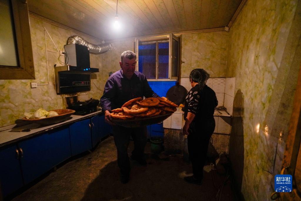 新疆尉犁縣巴西買里村,回到家中,爾肯·熱衣木幫著愛人一起炸油餅(4月21日攝)。