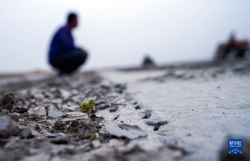 新疆尉犁縣巴西買里村,天色漸暗,爾肯·熱衣木蹲在棉田里,看著拖拉機來回作業,盼著田里的棉花嫩芽全部成活(4月21日攝)。