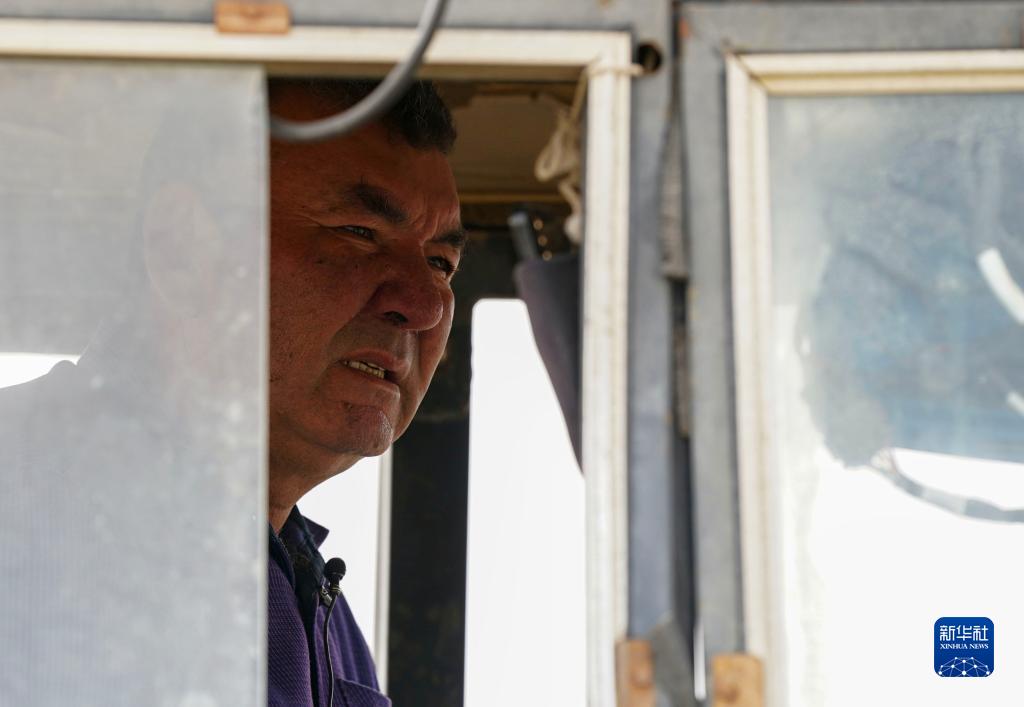 新疆尉犁縣巴西買里村,爾肯·熱衣木坐在拖拉機里,看著鋪膜和播種情況(4月21日攝)。