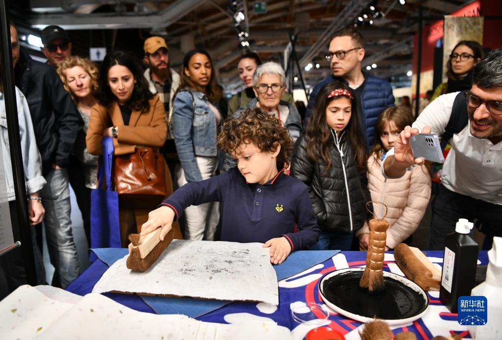 4月25日,在意大利佛羅倫薩舉辦的國際手工藝展覽會上,一名兒童體驗中國木版年畫拓印互動項目。