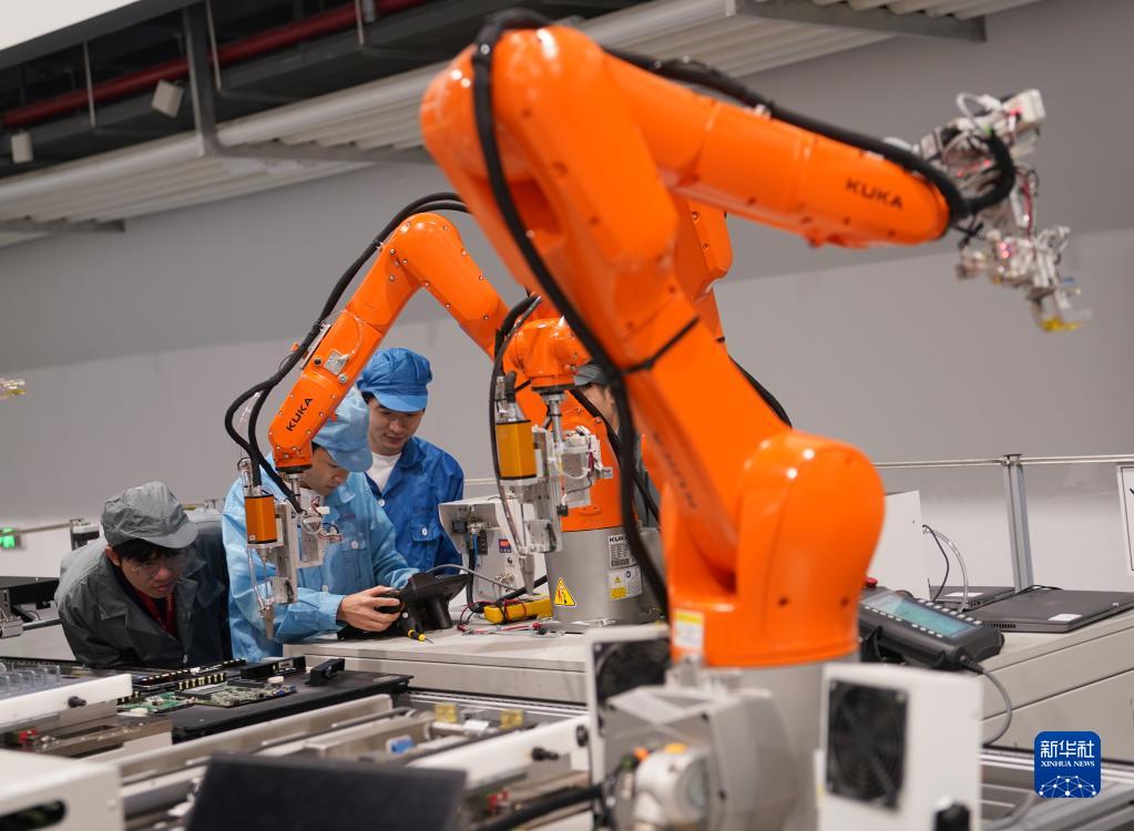 4月27日,在位于浙江杭州市蕭山區的紫光股份信息通信產品未來工廠,技術人員在調試生產線設備。