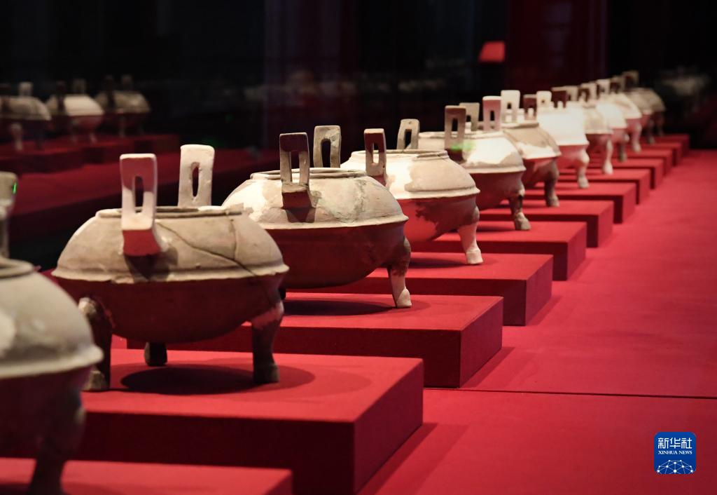 這是曹操高陵遺址博物館內(nèi)展出的陶鼎(4月22日攝)。
