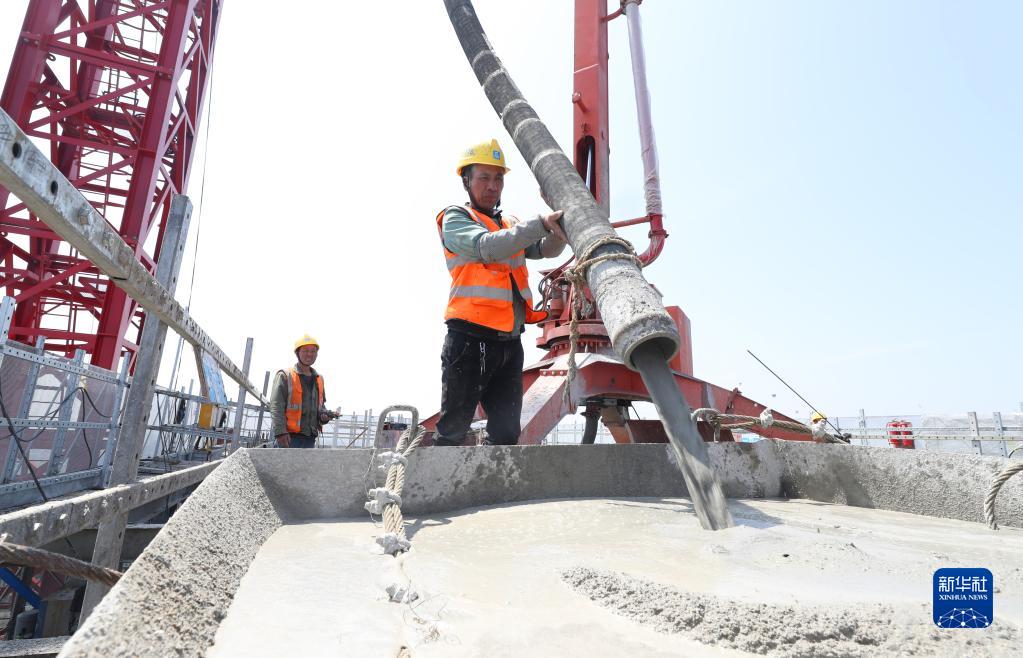 4月27日,工人在臨港西島中銀金融中心項(xiàng)目南塔樓核心筒頂部施工現(xiàn)場(chǎng)進(jìn)行混凝土澆筑前的通泵作業(yè)。
