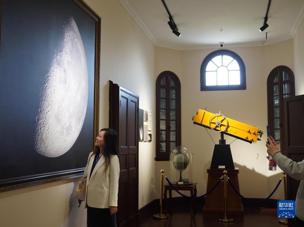 4月27日,觀眾在40厘米口徑大雙筒折射望遠鏡1901年拍攝的月球表面照片前留影。