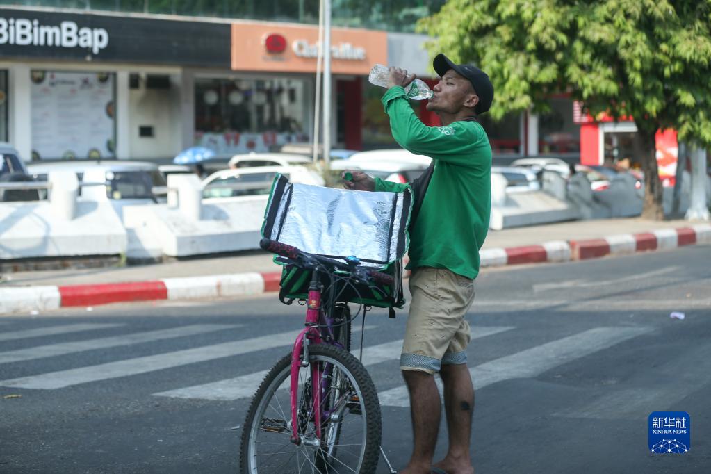4月27日,一名男子在緬甸仰光街頭喝水消暑。
