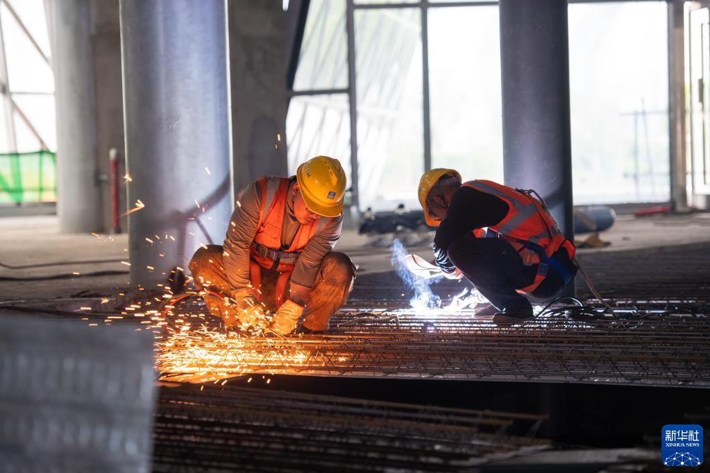 4月28日,在郴州市文體中心建設工地,中建五局裝飾公司工人在進行鋼結構桁架樓層板安裝作業。