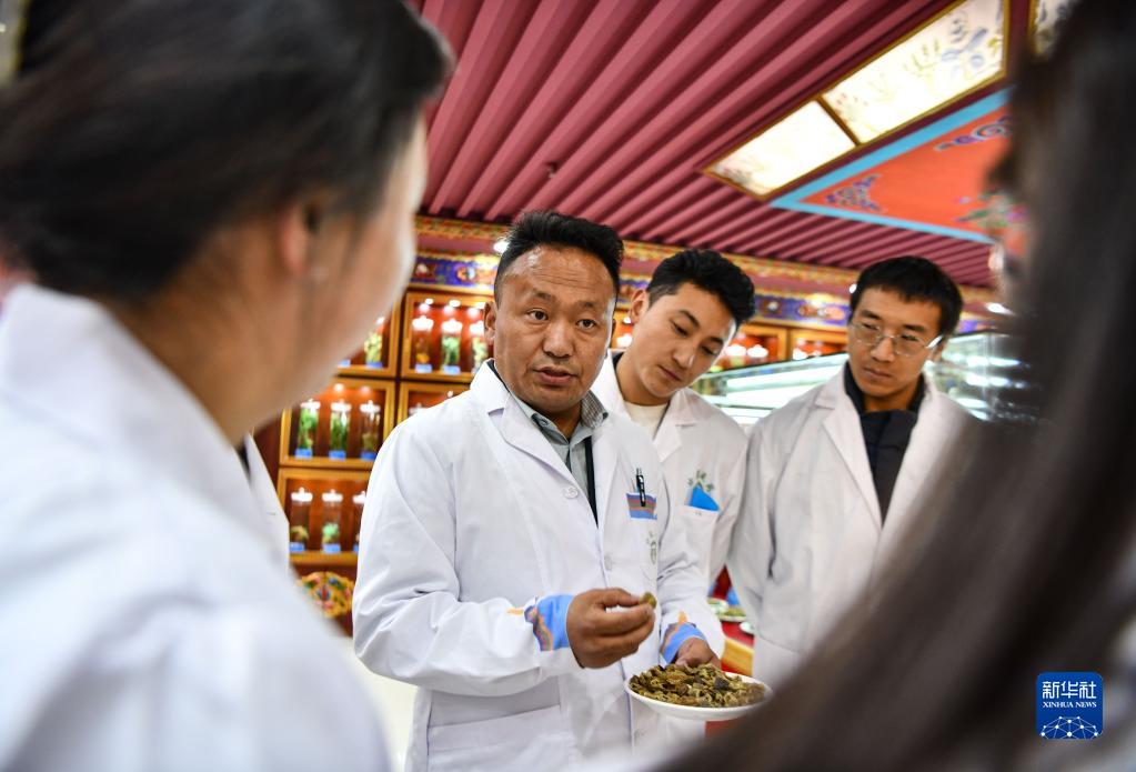 在藏藥材標本室,普窮次仁為學生們講解藏藥材知識(4月20日攝)。