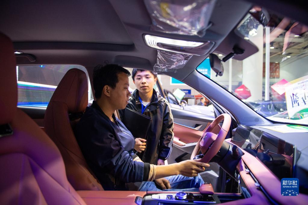 4月28日,工作人員(右)向觀眾介紹參展汽車。