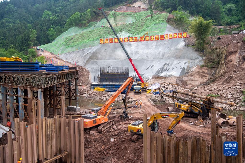 4月28日,工程機械在成達萬高速鐵路建設現場施工作業。