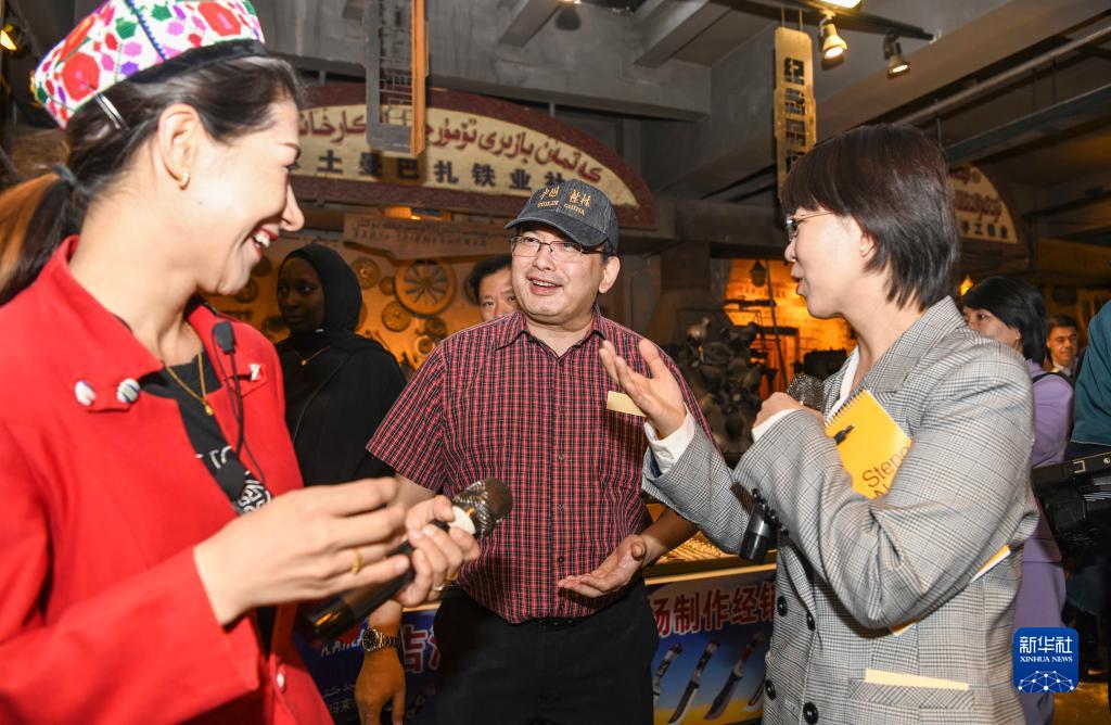 在新疆喀什古城景區鐵匠巴扎,印度尼西亞駐廣州總領事斌德加(中)和喀什當地導游(左)聊天(4月24日攝)。新華社記者 胡虎虎 攝