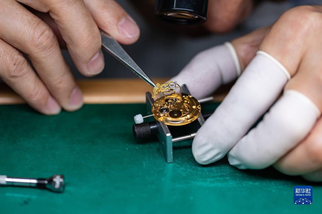 4月25日,在位于深圳的飛亞達(dá)鐘表大廈,劉中華為一塊手表安裝擺輪部件。新華社記者 毛思倩 攝