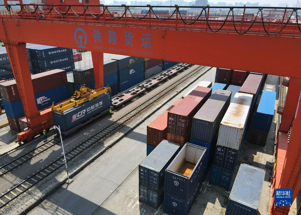 在鐵路合肥貨運中心合肥北站物流基地,吊車司機將中歐班列集裝箱吊運到列車上(4月27日,無人機照片)。