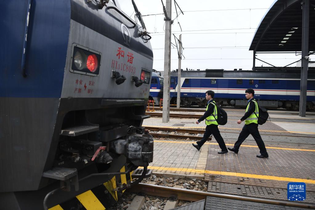 4月28日,尚志雄(左)和副司機田錦波準備登上值乘的中歐班列機車。新華社記者 金劍 攝