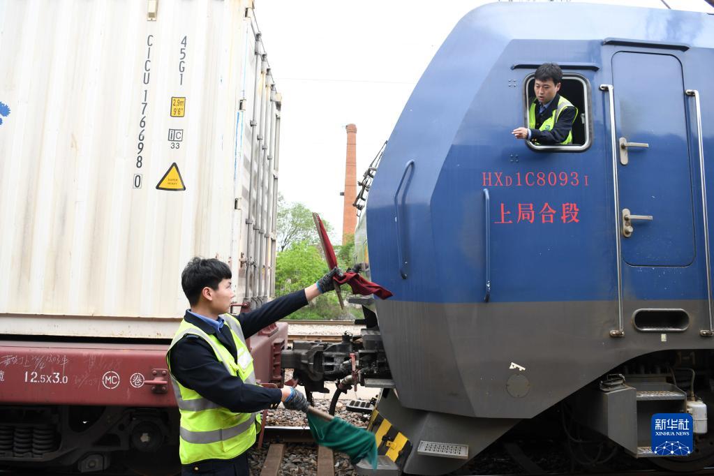 4月28日,副司機(jī)田錦波(左)在合肥東站指揮機(jī)車與中歐班列列車對(duì)接。新華社記者 劉軍喜 攝