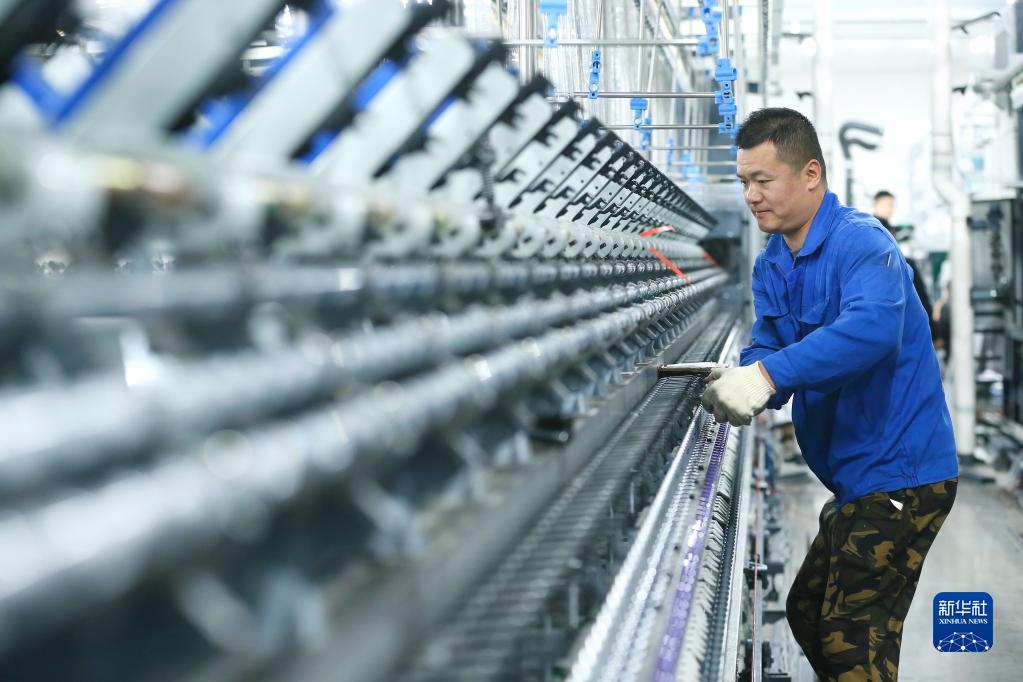 4月29日,技術(shù)工人在山東省青島市即墨區(qū)即發(fā)龍山工業(yè)園的一處數(shù)字化智能紡紗工廠安裝生產(chǎn)設(shè)備。