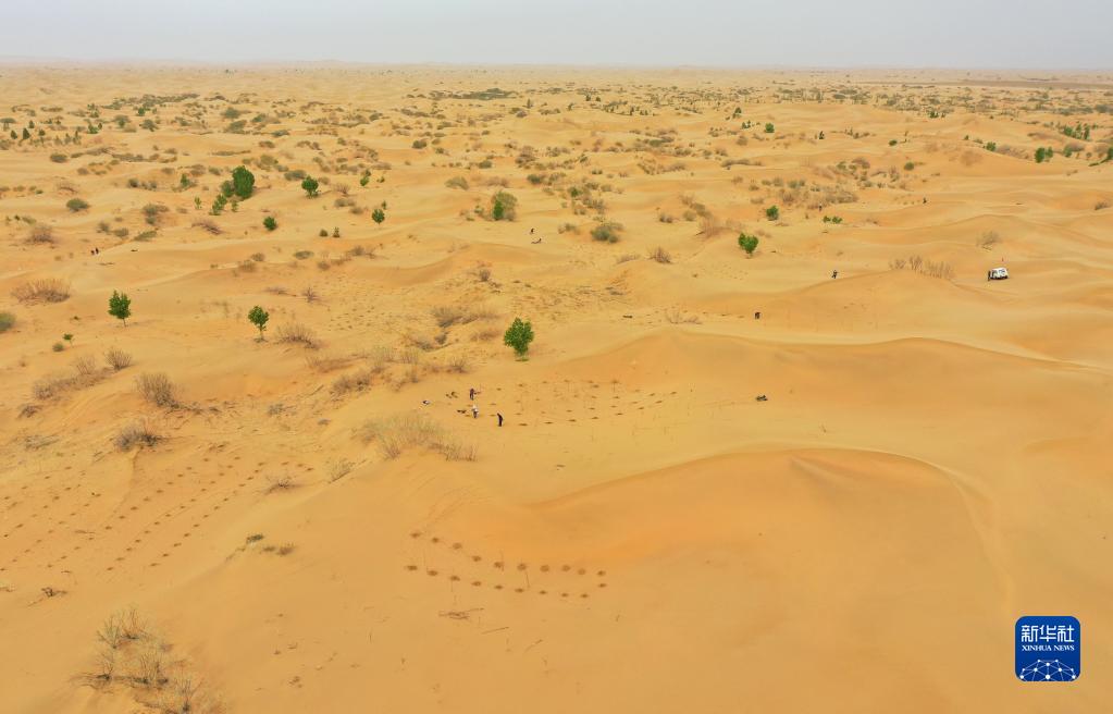 治沙客在內蒙古庫布其沙漠億利生態治理區種植苗木(4月27日攝,無人機照片)。