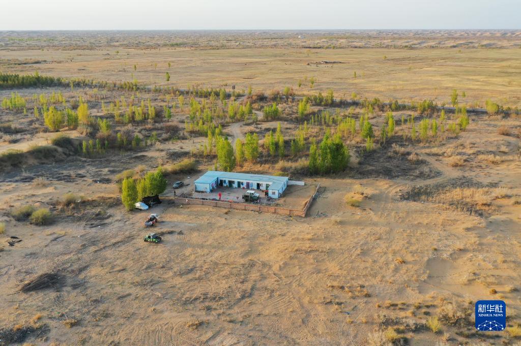 這是朱虎明團(tuán)隊居住的臨時板房,位于庫布其沙漠億利生態(tài)治理區(qū)(4月25日攝,無人機照片)。