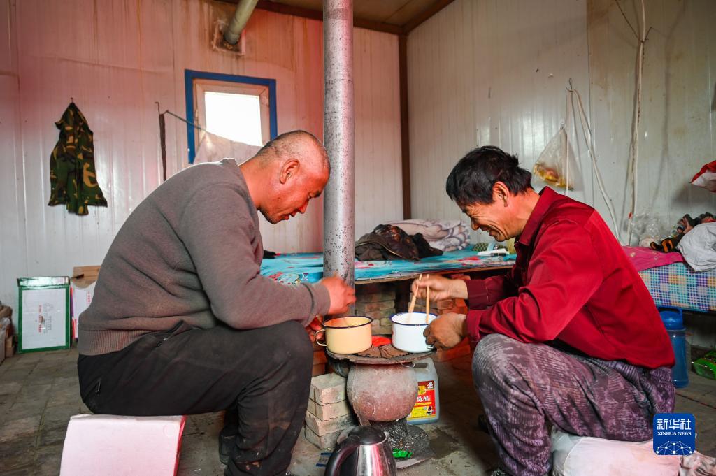 干完活回到臨時(shí)板房后,治沙客毛福平(左)和老鄉(xiāng)劉金成在吃泡面(4月27日攝)。