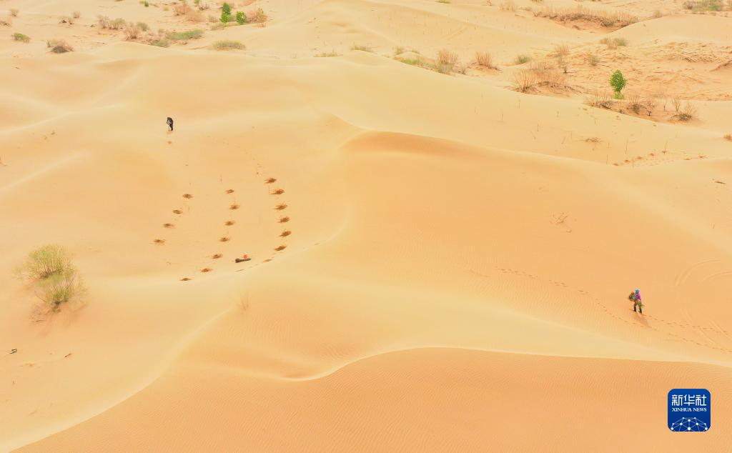 治沙客在內蒙古庫布其沙漠億利生態(tài)治理區(qū)種植苗木(4月27日攝,無人機照片)。
