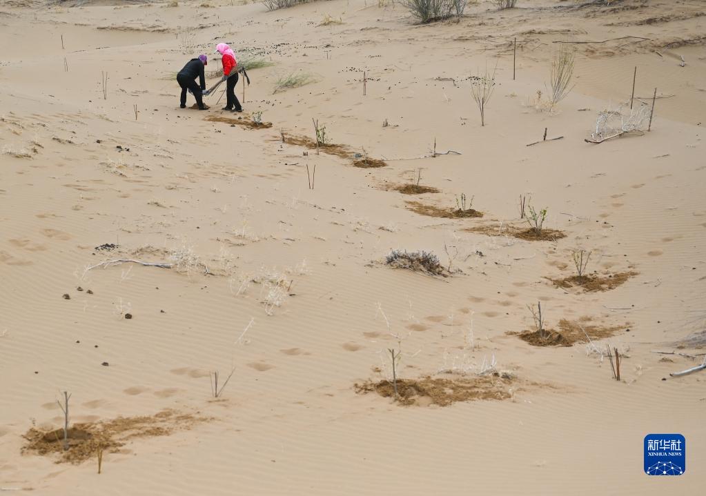 治沙客在內蒙古庫布其沙漠億利生態治理區種植苗木(4月27日攝)。