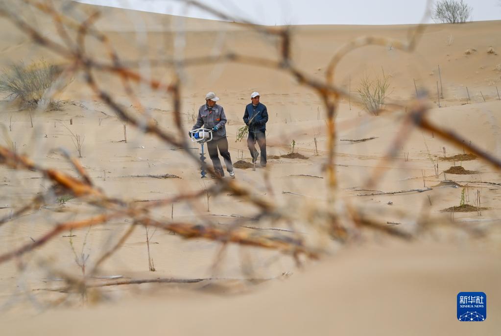 治沙客在內蒙古庫布其沙漠億利生態治理區種植苗木(4月27日攝)。