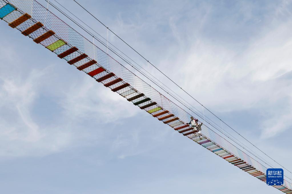 4月29日,游客在江蘇省宿遷市泗洪縣界集鎮夢幻樂園七彩玻璃橋上挑戰高空行走。