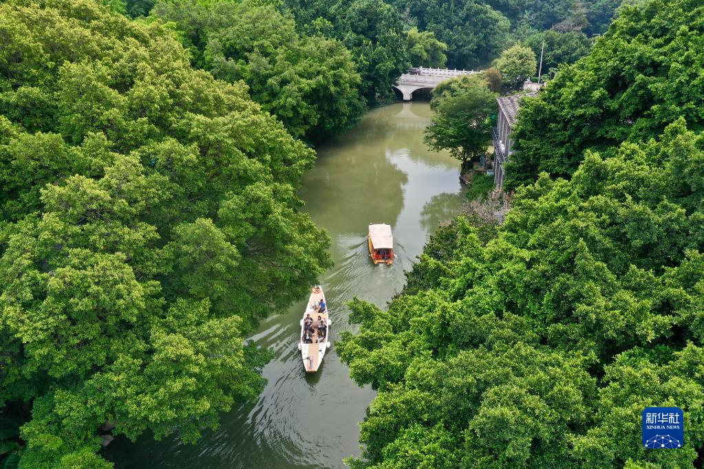 4月29日,游客乘坐游船游覽福州白馬河(無人機照片)。