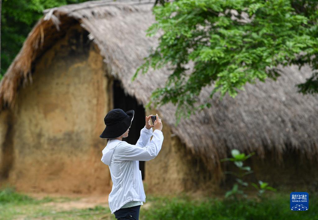 4月28日,游客在海南省東方市白查村參觀、拍攝黎族船型屋。