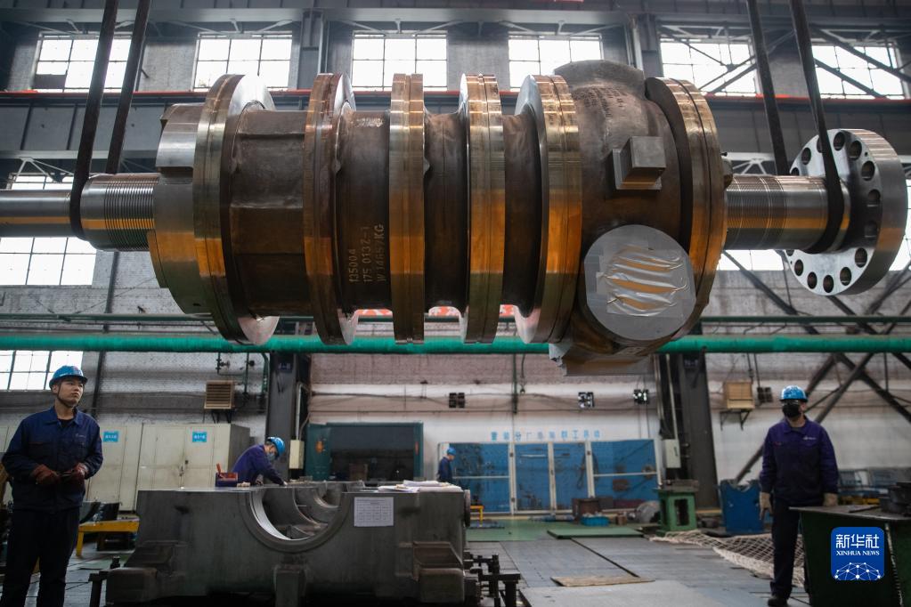4月28日,工作人員在哈電集團(tuán)哈爾濱汽輪機(jī)廠有限責(zé)任公司車間內(nèi)準(zhǔn)備組裝設(shè)備。