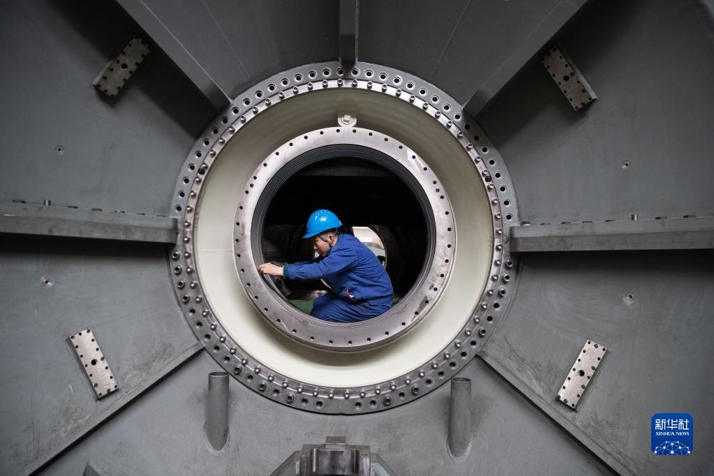 4月28日,工作人員在哈電集團(tuán)哈爾濱汽輪機(jī)廠有限責(zé)任公司車間內(nèi)測量設(shè)備尺寸。