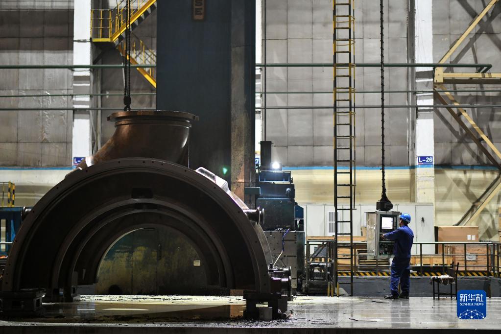 4月10日,工作人員在哈電集團哈爾濱汽輪機廠有限責任公司車間內操控大型數控設備。