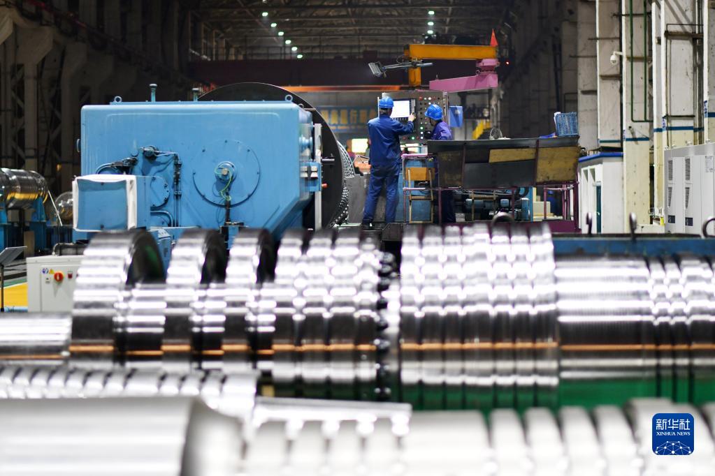 4月10日,工作人員在哈電集團哈爾濱汽輪機廠有限責任公司車間內操控大型數控設備。