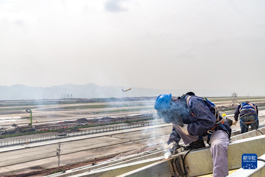 4月29日,工作人員在重慶江北國際機(jī)場T3B航站樓施工現(xiàn)場進(jìn)行焊接作業(yè)。