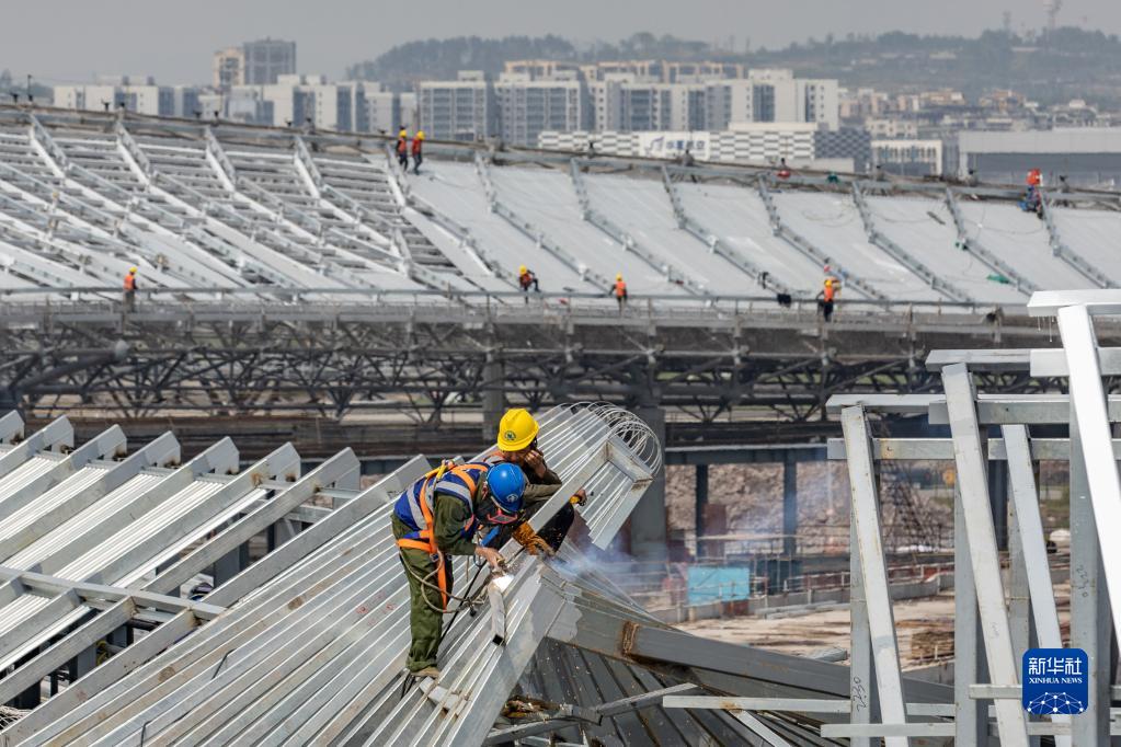4月29日,工作人員在重慶江北國際機場T3B航站樓施工現場進行屋面施工。