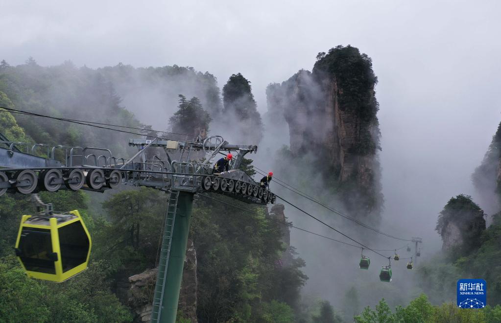 4月24日,張家界國家森林公園楊家界索道檢修工在巡檢設備,排除安全隱患,保障游客游覽安全(無人機照片)。